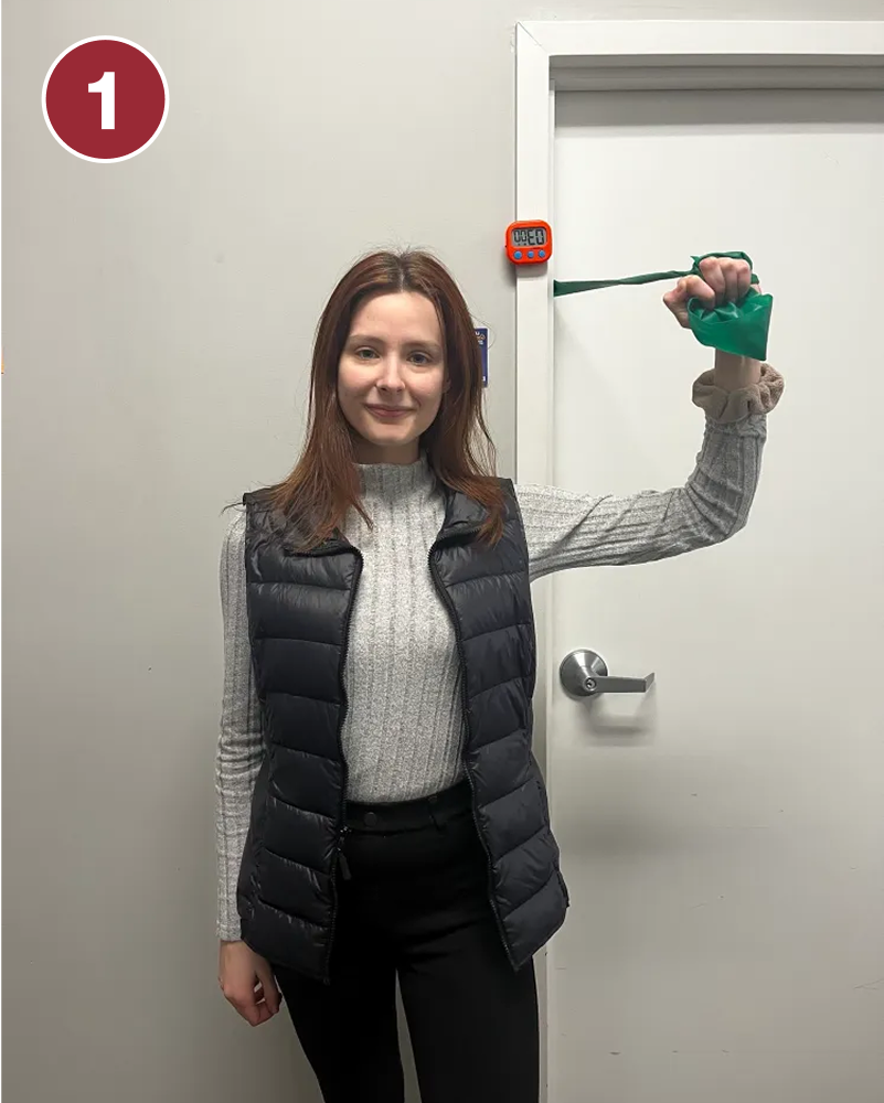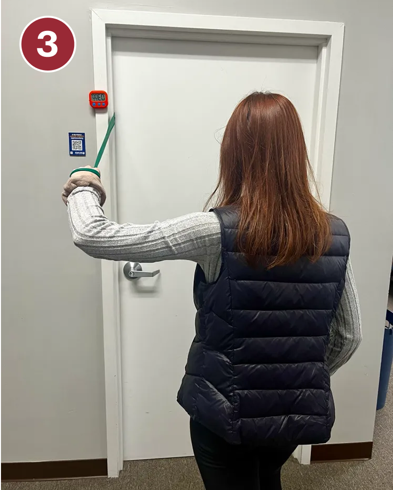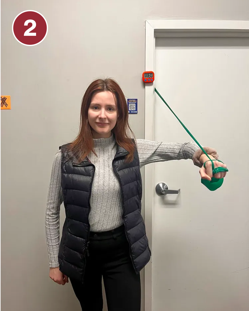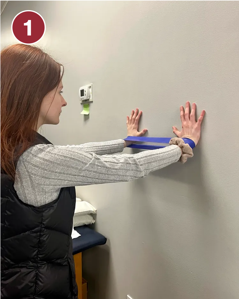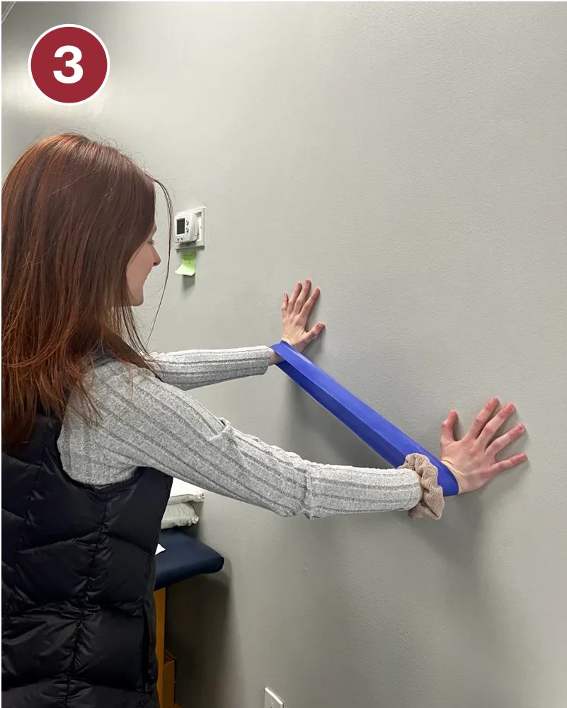 - Stand up straight facing a wall with a resistance band around both hands