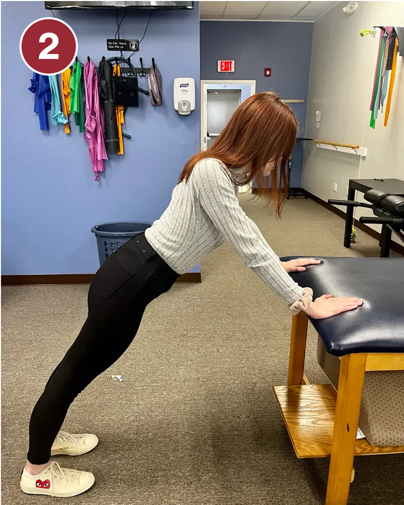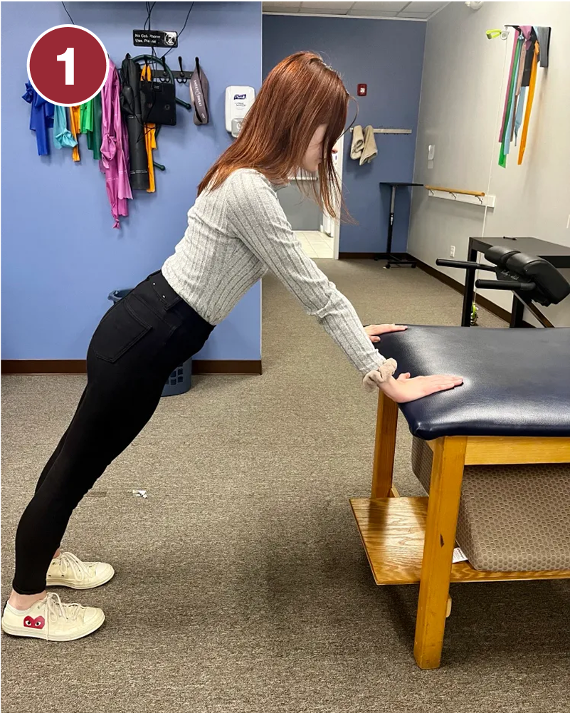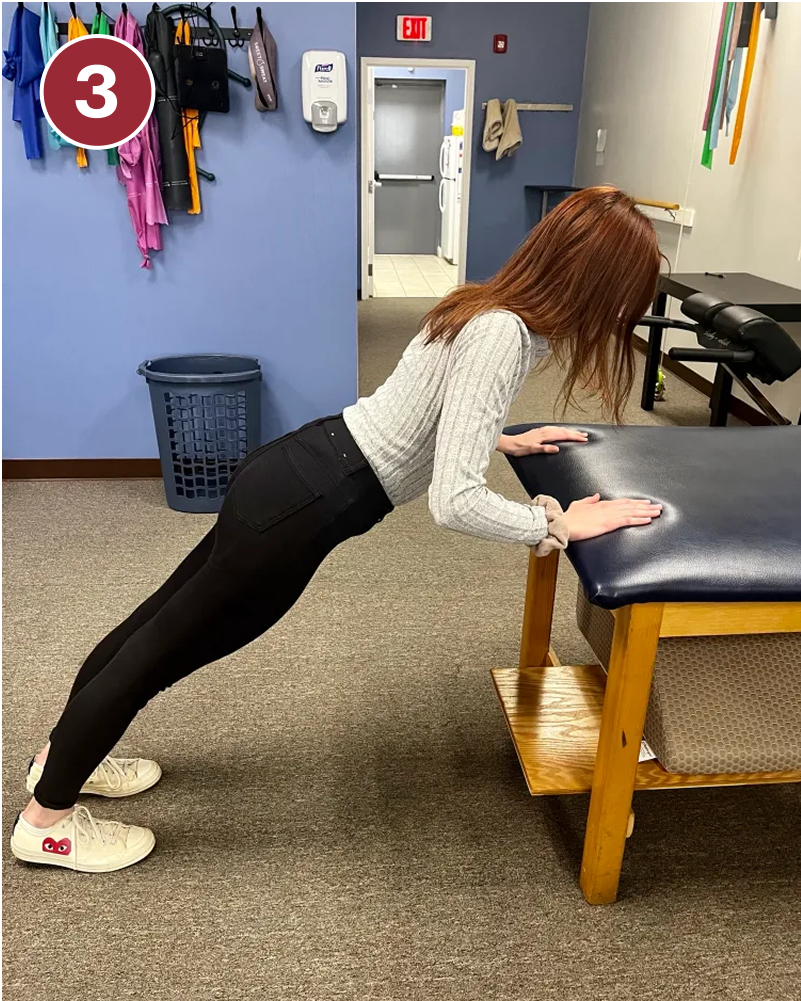 - Leaning on a countertop or edge of a sturdy couch, position your body with your arms straight and your abdominals engaged