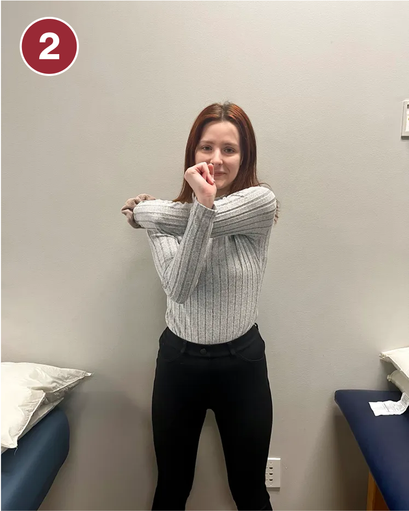- Place the opposite hand on the outside of your elbow and gently hug your arm across your body