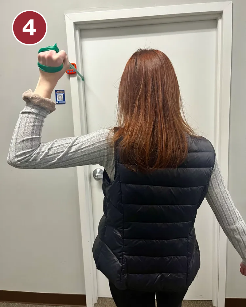 - Stand upright holding a resistance band anchored in a door slightly higher than shoulder-height