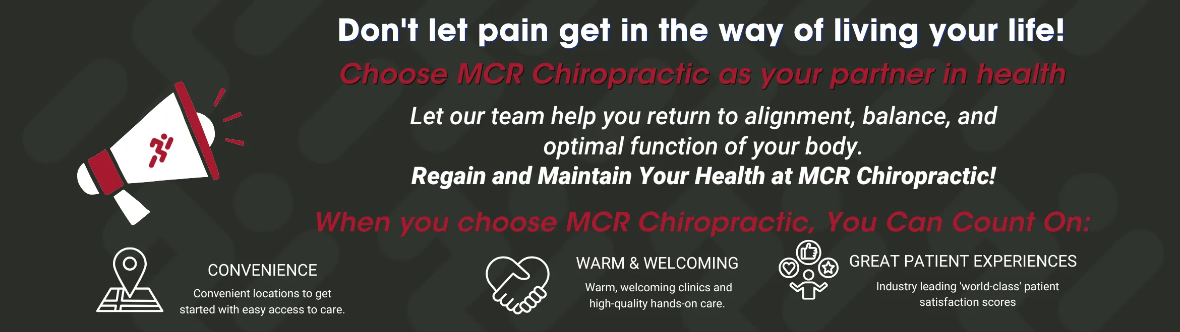 Don’t wait for a small ache or pain to result in a major disruption in your life. Call any MCR Chiropractic location to request an appointment.